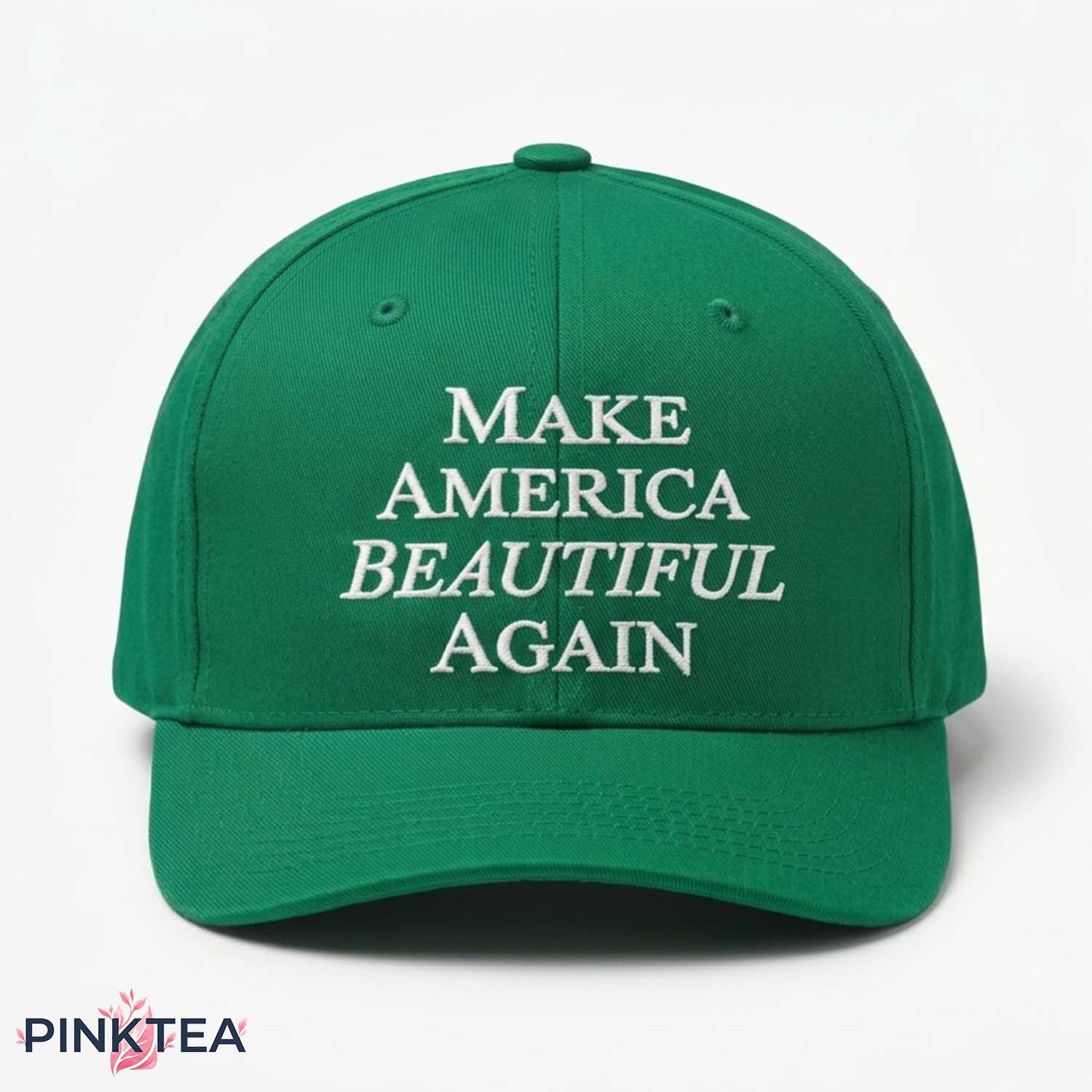 The front of the Make America Beautiful Again Hat features a bold green crown and matching curved brim, creating a fresh, eye-catching color base that instantly stands out. Centered across the front is the embroidered phrase “MAKE AMERICA BEAUTIFUL AGAIN” in crisp white serif lettering, stacked neatly for a balanced and polished look. The contrast between the rich green fabric and the bright white embroidery gives the hat a clean, preppy, slightly vintage campaign aesthetic. Its structured shape and minimalist design make it easy to pair with casual outfits while still carrying enough personality to spark attention.