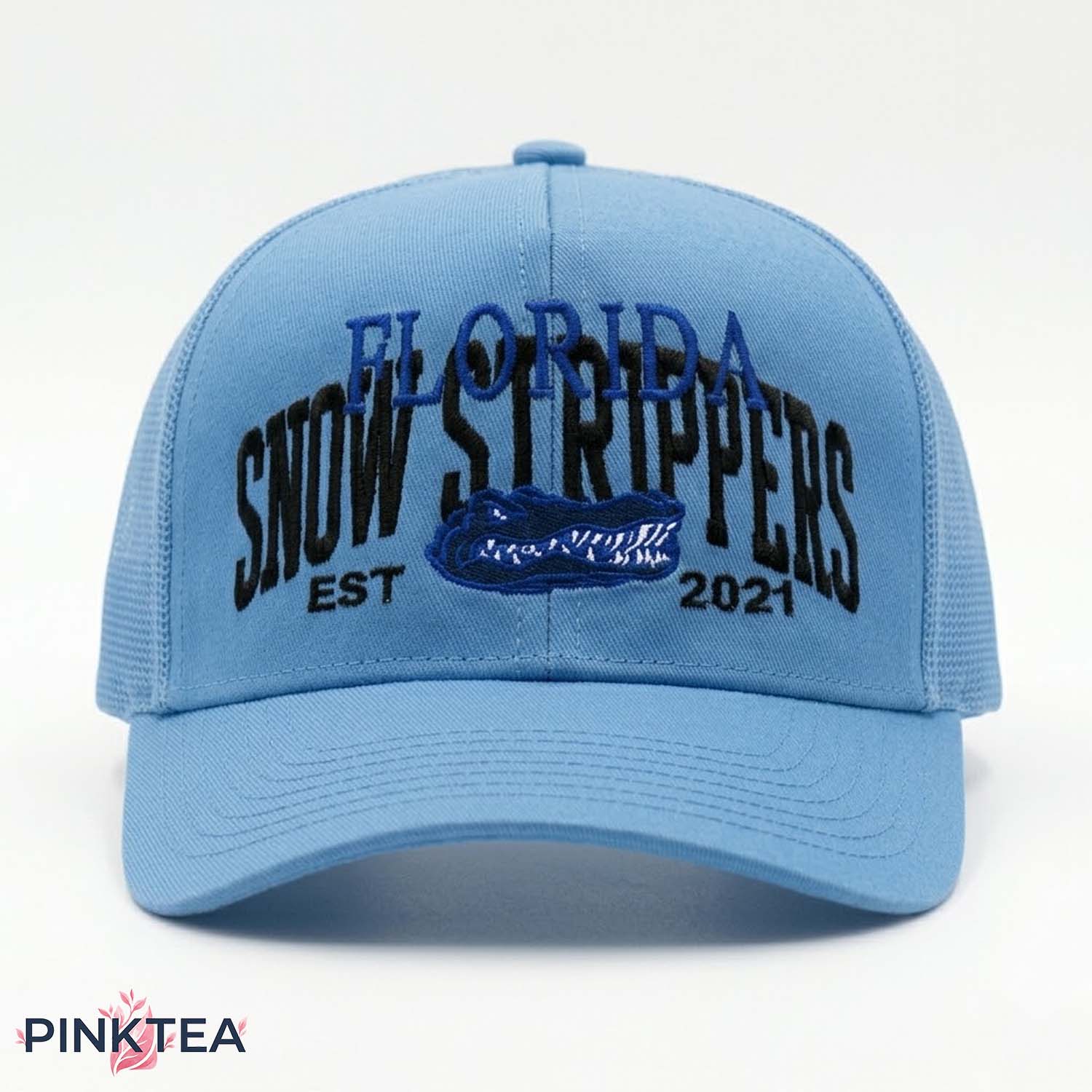 The Snow Strippers Florida Est 2021 Hat features a soft light blue crown and matching curved brim with breathable mesh side and back panels for a classic trucker-style fit. Across the front, the embroidery stacks “FLORIDA” over a large arched “SNOW STRIPPERS” graphic in dark lettering, with “EST 2021” placed below for a pseudo-brand or underground-label feel. At the center sits a small embroidered alligator graphic in blue, tying the design back to Florida imagery while adding a slightly chaotic, offbeat touch. The contrast between the icy blue base and darker stitched details gives the hat a crisp visual that feels both casual and intentionally niche.
